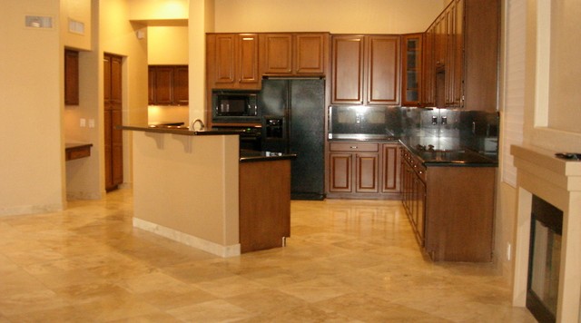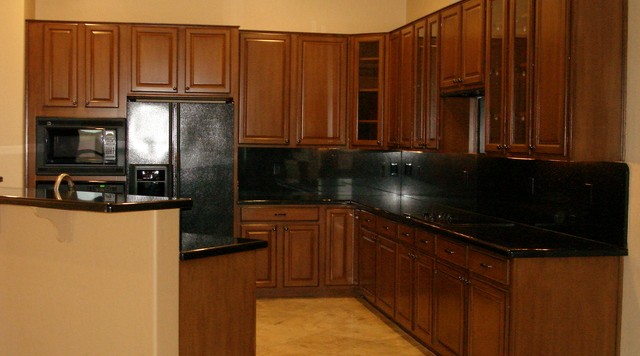 -Remolded kitchen with black granite counter tops and back splash, Under kitchen cabinet lighting, GE profile appliances (Electric)