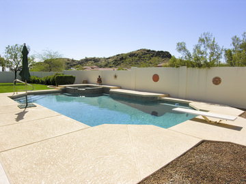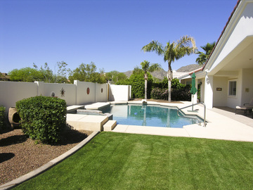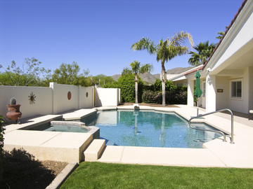 PRESTIGIOUS ESTATES HOME ON 1/2 ACRE PREMIUM MTN VIEW LOT. BEAUTIFULLY MAINTAINED, FLOODED W/ NATURAL LIGHT, CLEAN & UPDATED. SINGLE LEVEL "SPLIT" FLOOR PLAN W/ 5TH BEDROOM/ LIBRARY & MASTER SUITE SEPARATED FROM 3 CHILDRENS BEDROOMS. TWO ADDITIONAL BEDROOMS W/ JACK-&-JILL BATH, 3RD BEDROOM W/ PRIVATE BATH, & GUEST 1/2 BATH. LARGE KITCHEN FEATURES NEW (2/08) STAINLESS STEEL APPLIANCES. MASTER HAS LARGE DOUBLE SPA TUB, BIG WALK-IN CLOSET, & 2-WAY FIREPLACE INTO THE SPACIOUS MASTER BEDROOM. SUNNY BREAKFAST ROOM OPENS TO FAMILY ROOM WITH FIREPLACE. FORMAL LIVING & DINING ROOMS. LUSH PARK-LIKE BACKYARD BACKING SOUTH TO DESERT ARROYO W/ FULL MTN VIEWS, TOTAL PRIVACY, EXPANSIVE LAWN, LARGE NEWLY FINISHED PEBBLE POOL W/ NATURAL SLATE TRIM, & HUGE PATIO W/ CUSTOM FOUNTAIN. 3.5 CAR GARAGE.