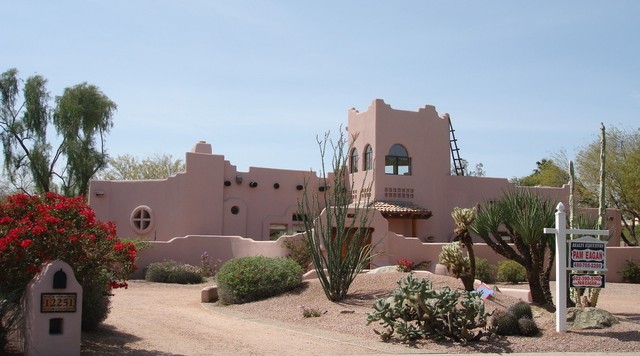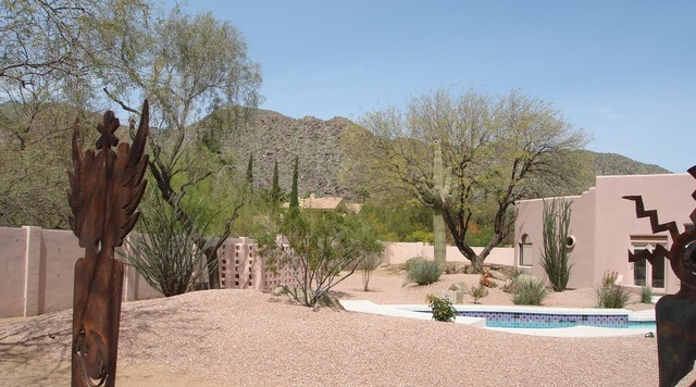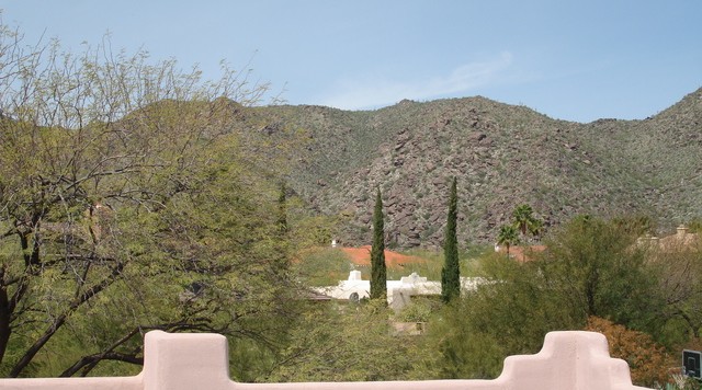 Unique, one of a kind Territorial remodel, once featured on the cover of Phoenix Home and Garden magazine, designed by one of Phoenix’s most prominent artists. Sits elegantly on a acre cul de sac lot. Wonderful flow, this 3 bedroom plus huge game room/studio, small office, and observatory/meditation room/tower above the great room w/ 13' ceilings is light and airy & move in ready. Newly appointed marble and granite kitchen and bathrooms. Artisticly designed with 20 dual sided, hand sculpted fireplace, periscope windows, vigas and latillas, and circular staircase. Fantastic curb appeal, quietly tucked far back from the street, charming serene gated courtyard entry and circular drive. Park like backyard, surrounded by desert arroyo and 180 degrees of picturesque mountains and dive pool. Truly a magical space, finally on the market offered by the original owners for the discriminating buyer whos looking for the unique.