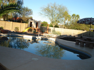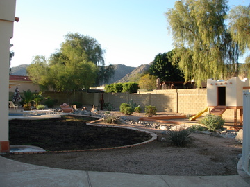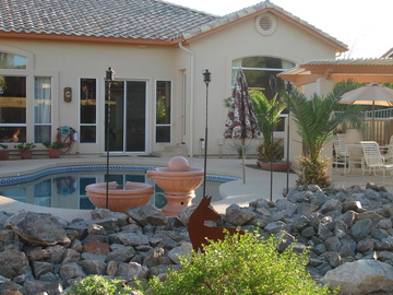 QUALITY CUSTOM HOME ON 1/2 ACRE LOT W/ 4-CAR GARAGE. DARK WOOD LAMINATE FLOORS, PLANTATION SHUTTERS, & CENTRAL VAC. LARGE FORMAL LIVING & DINING ROOMS AND BIG LAUNDRY ROOM W/ SINK . 900 SQUARE FOOT MASTER BEDROOM SUITE W/ COFFERED CEILINGS & ATRIUM DOORS & MASTER BATH W/ SEPARATE TUB & SHOWER, WALK-IN CLOSET, & DOUBLE HAND PAINTED SINKS. KITCHEN W/ SLAB GRANITE, LARGE ISLAND, JENN AIRE CONVECTION OVEN, STAINLESS STEEL MICROWAVE, 42" NATURAL RED OAK CABINETS, BRUSHED NICKEL FAUCET, PENDANT LIGHTING, NEW REVERSE OSMOSIS, LARGE PANTRY, & BREAKFAST ROOM. BACKYARD W/ IMPOSING MOUNTAIN VIEWS, COVERED PATIO, 5' PEBBLE POOL & FOUNTAIN, GAZEBO/ RAMADA, DOG RUN, & PUEBLO PLAY HOUSE. ALL NEWER INTERIOR LIGHT FIXTURES & INTERIOR PAINT (2009). 2 HEAT PUMPS & WATER HEATER (2 YEARS NEW).